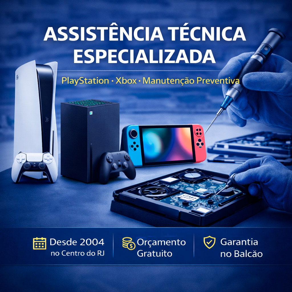Manutenção Preventiva (Limpeza Completa): Seu game parece uma turbina de avião? Fazemos a limpeza interna completa e troca da pasta térmica (prata) para evitar o superaquecimento e a queima do processador.